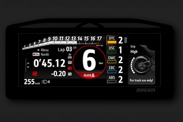 Ducati war 2012 der erste Hersteller, der mit der 1199 Panigale ein Full-TFT-Farbdisplay in ein Motorrad integrierte. Mit der Panigale V4 7G und Streetfighter V4 3G setzt Ducati erneut Maßstäbe: Das hochauflösende 6,9-Zoll-Full-TFT-Display im Seitenverhältnis 8:3 (1.280 x 480 Pixel) zeigt eine Vielzahl an Informationen mit optimaler visueller Klarheit an, ohne die Sicht des Fahrers in der aerodynamischen Fahrposition zu beeinträchtigen. Das Dashboard nutzt die Optical Bonding-Technologie, die auch bei Smartphones zum Einsatz kommt. Anstelle einer Kunststoffbeschichtung schützt eine verklebte Glasschicht den Bildschirm, die keinen direkten Kontakt zum Display hat. Dies gewährleistet eine hervorragende Lesbarkeit der Informationen, selbst bei Tageslicht. Der innere Bereich des Drehzahlmessers und die grüne LED am oberen Rand des Dashboards leuchten grün, wenn es Zeit zum Hochschalten ist, und wechseln auf Rot, wenn der Drehzahlbegrenzer erreicht wird. Die Navigation erfolgt über einen Schalter am linken Handgriff.