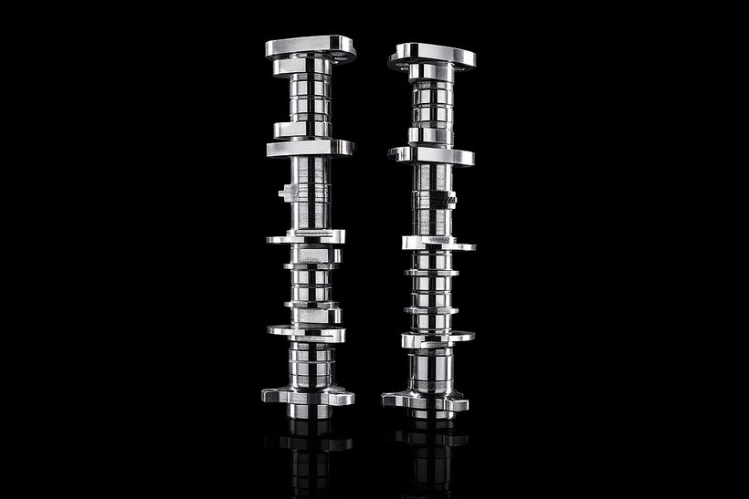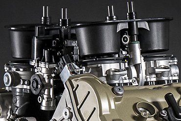 Vier Nockenwellen bedienen die 16 Ventile. Während die Einlassventile einen Durchmesser von 34 mm haben, aus Titanium gefertigt sind und – wie bei Rennmotoren – mit Titankeilen…