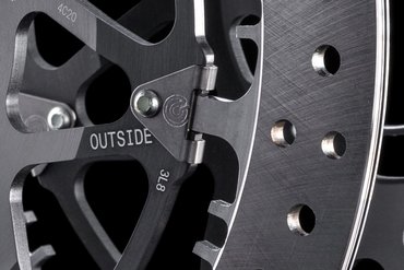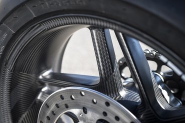 Felgen müssen robust und gleichzeitig leicht sein mit möglichst wenig Masse außen, um das Trägheitsmoment gering zu halten. In diesem Zusammenhang sind die Struktur und Dichte des Materials von großer Bedeutung. Die geschmiedeten 5/10-Speichen-Leichtmetallfelgen der Panigale V4 R, inspiriert von der Desmosedici GP, durchlaufen einen aufwendigen Produktionsprozess. Es handelt sich um ein Schmiedeverfahren, bei dem das Metall in einer Form unter hoher Temperatur mit Hilfe einer Presse verdichtet wird. Das Ergebnis: leichtere Felgen (2,95 kg vorne und 4,15 kg hinten) und ein dadurch reduzierter gyroskopischer Effekt, der ein Plus an Fahrdynamik bringt und sich positiv auf die Bremsperformance auswirkt. Zusätzlich reduziert sich das Aufstellmoment bei Bremsmanövern in Schräglage. Optional sind Felgen aus Carbon erhältlich, die das Gewicht um weitere 0,95 kg senken.