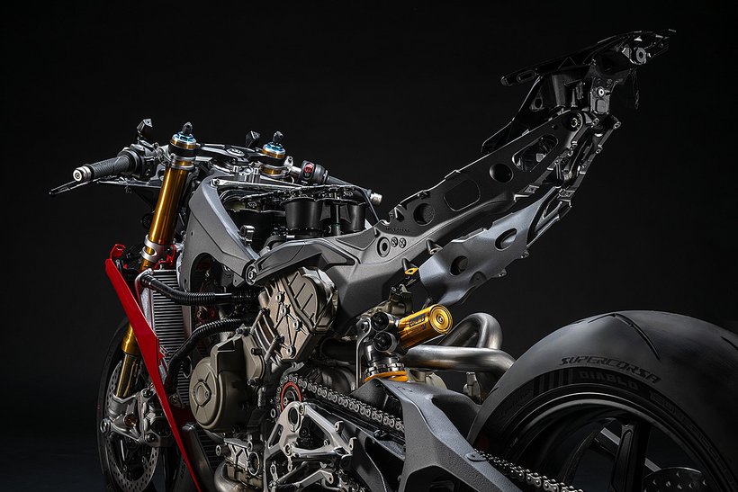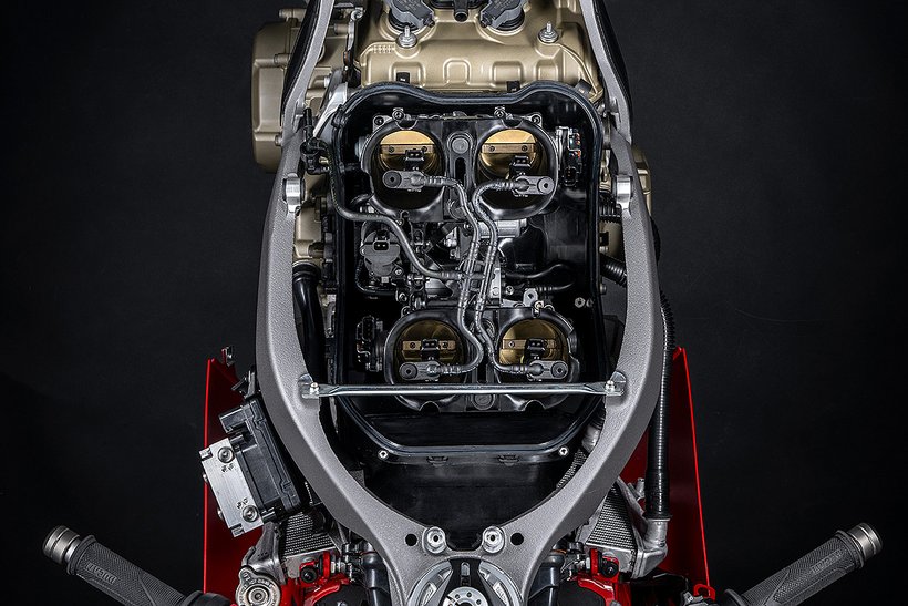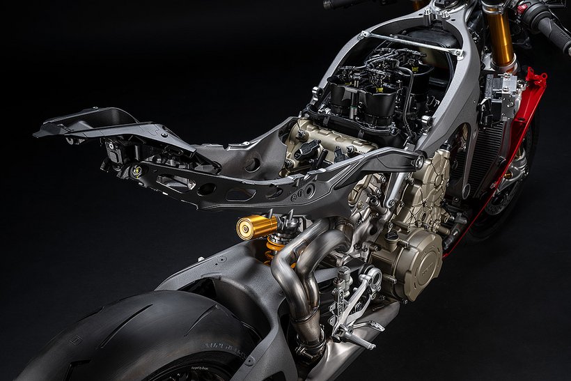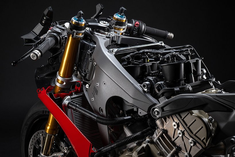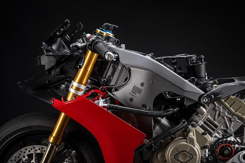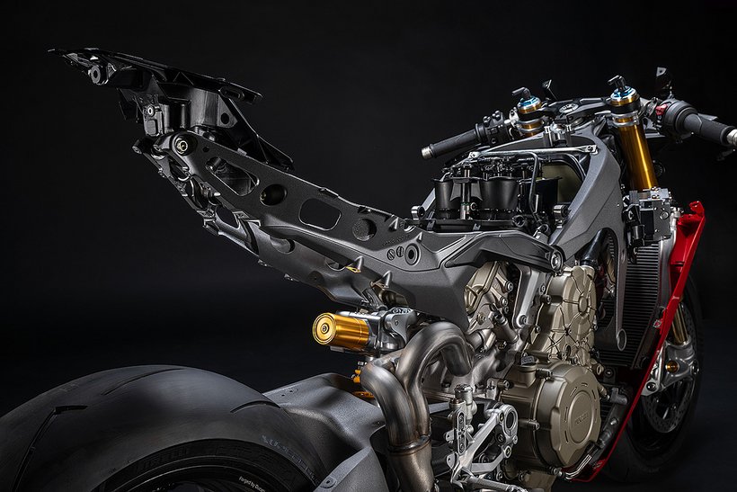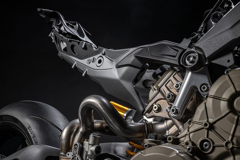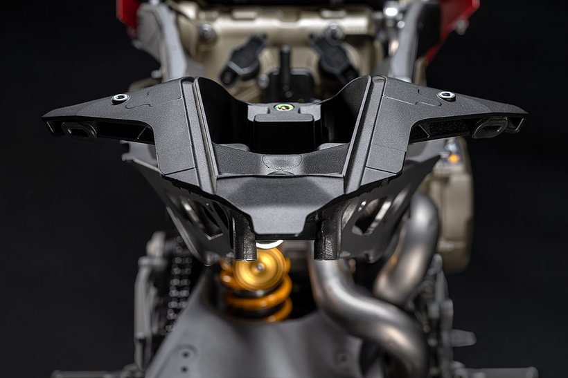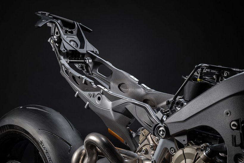 Der Hauptrahmen der Panigale V4 wird durch einen leichten Frontrahmen aus Technopolymer ergänzt, der sowohl das Cockpit als auch den Scheinwerfer trägt. Diese Lösung spart Gewicht und ermöglicht die Aufnahme der Elektronikkomponenten. Der Heckrahmen besteht aus zwei halbschalenförmigen Aluminiumgussteilen, die den unteren Bereich des Tanks unter dem Sitz umschließen. Im Inneren des Heckrahmens verlaufen zwei Luftkanäle, die gezielt heiße Luft aus dem Bereich des Motors nach hinten ableiten. Die Warmluft wird dabei über zwei Auslässe unterhalb des Hecks abgeführt, wodurch die thermische Belastung für Fahrer und auch Elektronik reduziert wird – besonders wichtig im Rennbetrieb oder bei hohen Außentemperaturen.