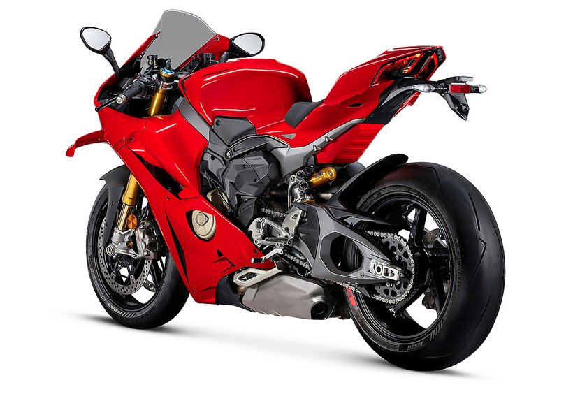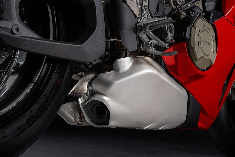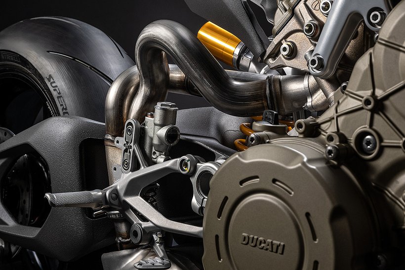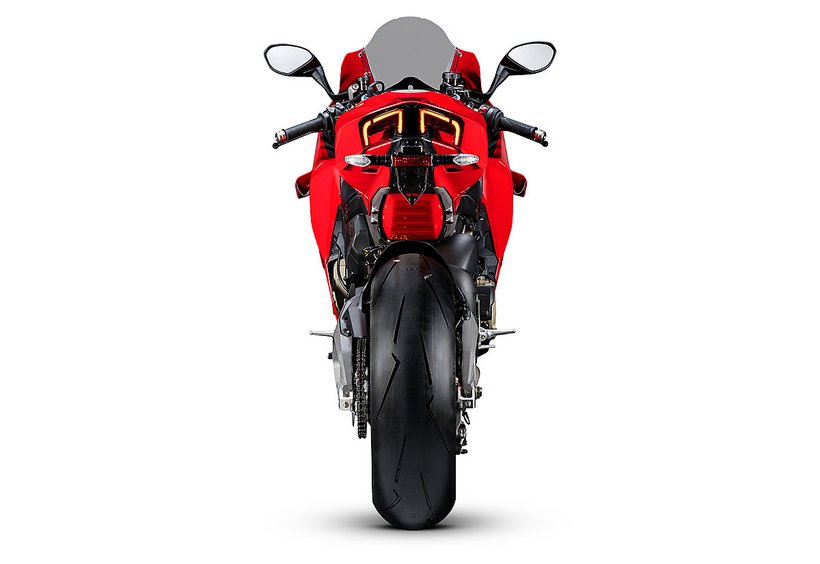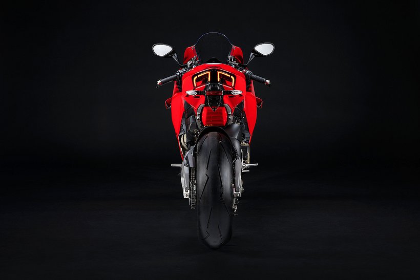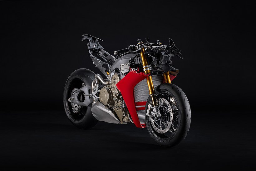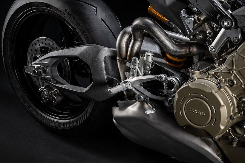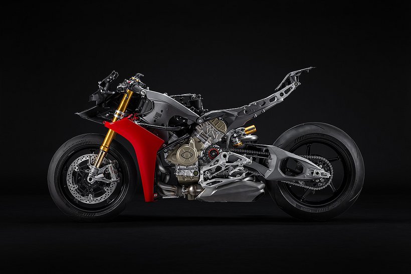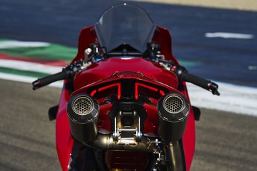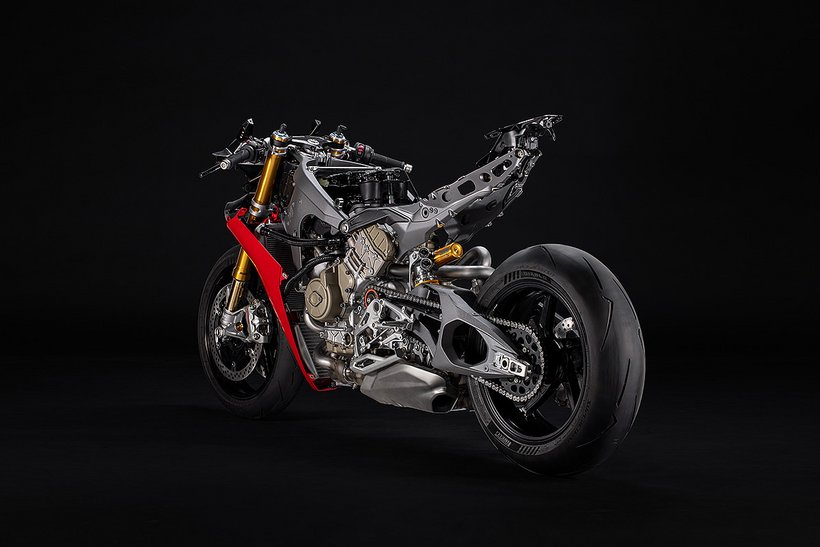 Der Hauptrahmen der Panigale V4 wird durch einen leichten Frontrahmen aus Technopolymer ergänzt, der sowohl das Cockpit als auch den Scheinwerfer trägt. Diese Lösung spart Gewicht und ermöglicht die Aufnahme der Elektronikkomponenten. Der Heckrahmen besteht aus zwei halbschalenförmigen Aluminiumgussteilen, die den unteren Bereich des Tanks unter dem Sitz umschließen. Im Inneren des Heckrahmens verlaufen zwei Luftkanäle, die gezielt heiße Luft aus dem Bereich des Motors nach hinten ableiten. Die Warmluft wird dabei über zwei Auslässe unterhalb des Hecks abgeführt, wodurch die thermische Belastung für Fahrer und auch Elektronik reduziert wird – besonders wichtig im Rennbetrieb oder bei hohen Außentemperaturen.
