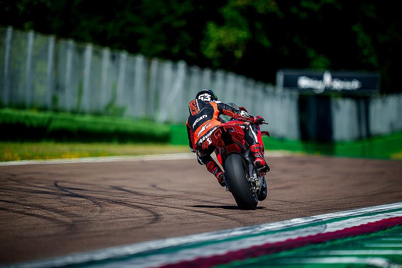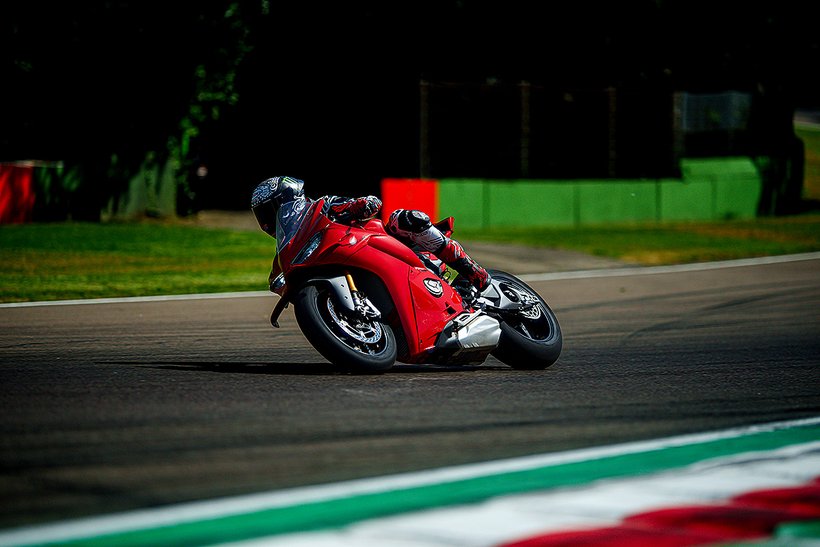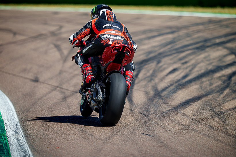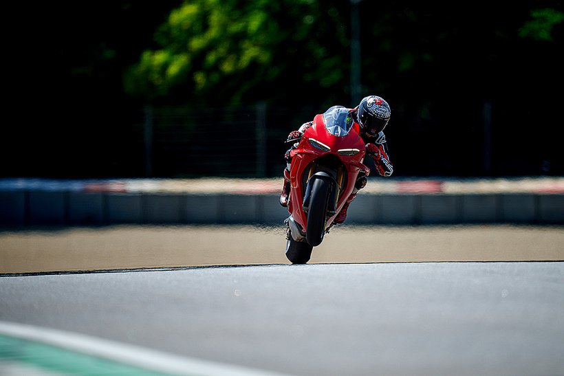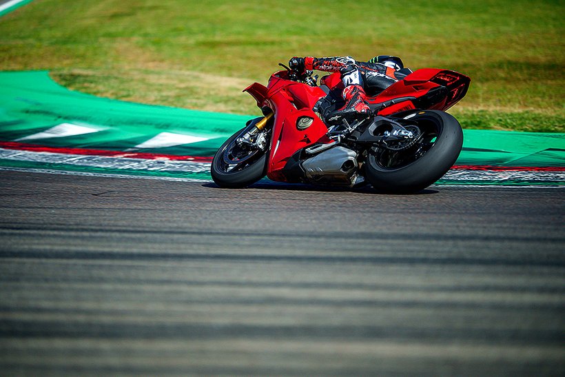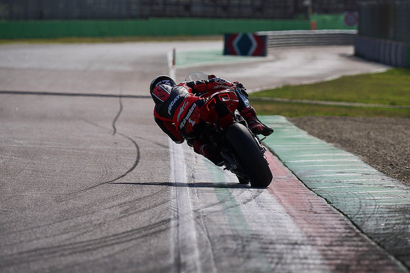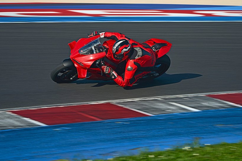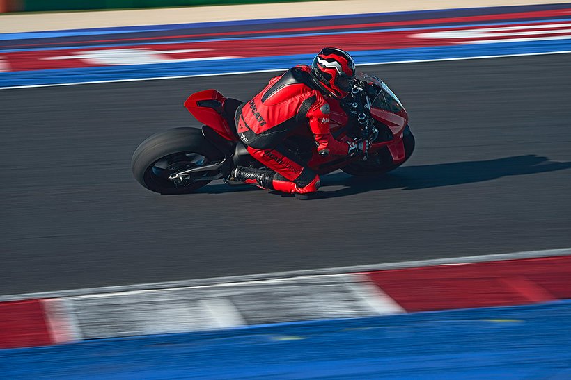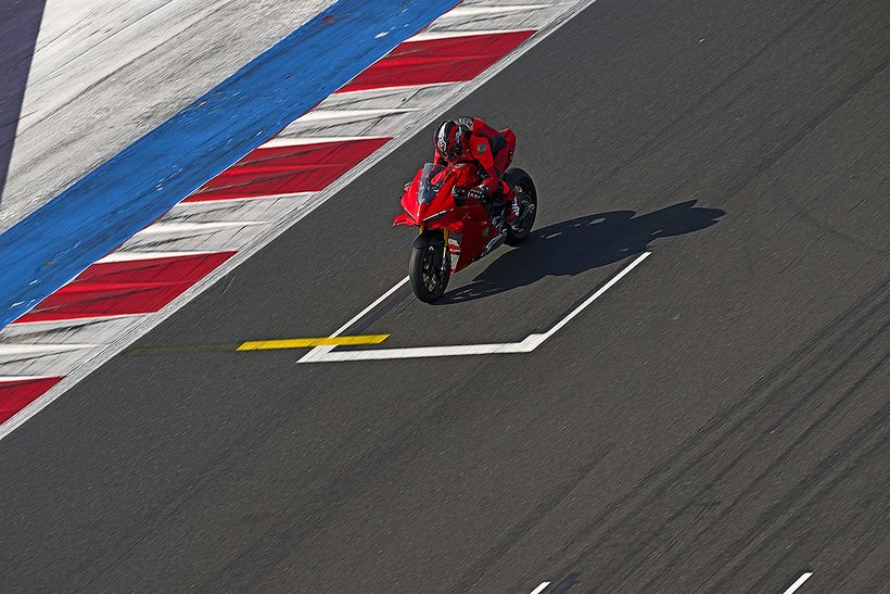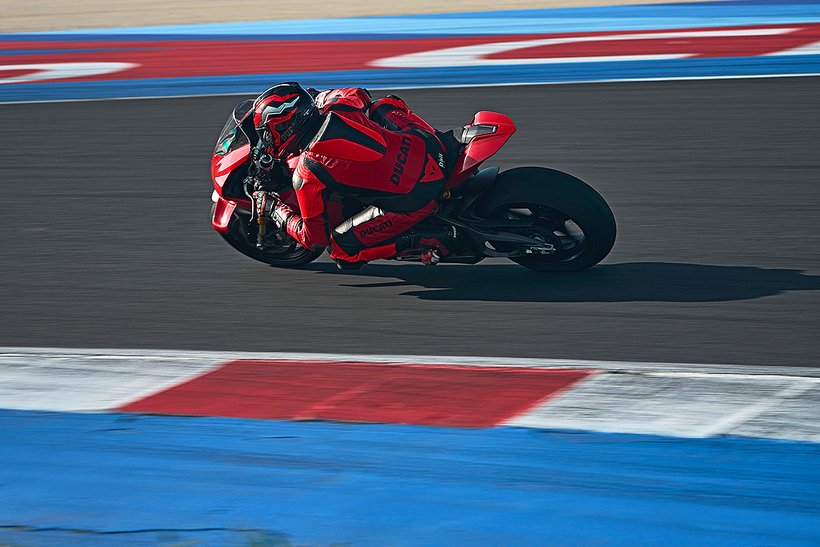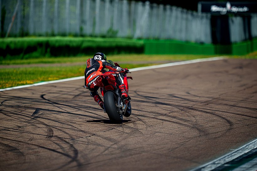 Eine weitere Innovation aus Borgo Panigale ist die Erweiterung des Cornering-ABS durch die Race eCBS-Funktion (Electronic Combined Brake System), die speziell für die Rennstrecke optimiert wurde. Das Race eCBS aktiviert automatisch die Hinterradbremse, wenn die Vorderradbremse betätigt wird. Die Bremskraft des Systems hängt vom Druck auf die Vorderradbremse und dem maximal zulässigen Schlupfwert des Hinterrads ab. Je nach Einstellungsstufe variiert die Bremskraft der Hinterradbremse: von durchschnittlich 7,5 % der auf die Vorderradbremse angewandten Bremskraft in Straßenmodi bis zu 15,5 % für das höchste Leistungsniveau, das für die Rennstrecke vorgesehen ist. Das Race eCBS-System bietet mehrere Stufen, die auf verschiedene Einsatzbedingungen und Fahrerpräferenzen abgestimmt sind. Stufen 1 bis 5 sind für den Einsatz auf der Rennstrecke bei trockenem Asphalt konzipiert. Stufe 6 ist für trockene Straßenbedingungen gedacht, während Stufe 7 für nasse Bedingungen optimiert ist. Der TrackPlus-Modus, verfügbar ab Stufe 1, ist für „Time Attack“-Sitzungen ausgelegt. Dieser Modus nutzt die maximale Bremskraft der Hinterradbremse und aktiviert die „Post Run“-Funktion. In Bremsphasen auf gerader Strecke oder in Kurven wird die Hinterradbremse aktiviert, wodurch die Frontlastigkeit reduziert und die Stabilität erhöht wird. In der Kurvenmitte hält die „Post Run“-Strategie den Druck auf der Hinterradbremse für kurze Zeit aufrecht, selbst nachdem der Fahrer die Vorderradbremse gelöst hat. Das System simuliert das Manöver eines professionellen Fahrers, der das Bremspedal nutzt, um die Linie in der Kurve zu halten. Dies ermöglicht es Amateurfahrern, professionelle Fahrtechniken zu nutzen, ohne die Hinterradbremse selbst steuern zu müssen, und verbessert die Bremsperformance. Zusätzlich wird die Hinterradbremse auch in Rechtskurven aktiviert, wo das Erreichen des Bremspedals schwieriger sein kann. Der Track-Modus, verfügbar ab Stufe 3, unterscheidet sich von Stufe 1 durch eine geringere Bremsleistung am Hinterrad und deaktiviert die „Post Run“-Strategie des eCBS. Stufe 3 zeichnet sich auch durch eine stärkere ABS-Intervention beim Bremsen auf gerader Strecke aus. Dieser Modus richtet sich an Fahrer, die ein Motorrad wünschen, das sich in der Mitte der Kurven sanfter bewegt und einen weniger aggressiven Fahrstil bietet.