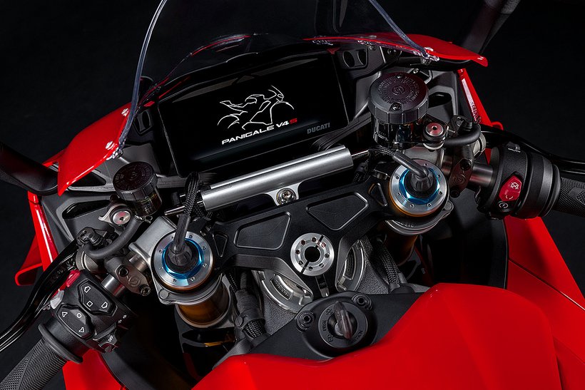 Die Panigale V4 S ist mit der neuesten Öhlins NPX 25/30-SV-Gasdruck-Gabel ausgestattet, die eine innovative „Spool Valve“ (SV) Technologie nutzt. Im Vergleich zu traditionellen Nadelventilen bietet die SV-Technologie einen erweiterten Einstellbereich der hydraulischen Komponenten, von vollständig offen bis vollständig geschlossen, mit höherer Sensibilität, Anpassungsgenauigkeit und schnellerer Reaktionsgeschwindigkeit. Diese Technologie ermöglicht eine präzisere Anpassung der Federung und beseitigt Kompromisse bei der Einstellung. Die Gabel bietet auf der Straße mehr komfort und auf der Rennstrecke eine straffere Abstimmung. Die Closed-Cartridge-Bauweise, die auch in der WorldSBK verwendet wird, minimiert das Risiko von Ölkavitationen. Die Gabel ist mit einem 25-mm-Kolben im linken Gabelholm zur Einstellung der Druckstufe und einem 30-mm-Kolben im rechten Gabelholm zur Einstellung der Zugstufe ausgestattet. Die Federvorspannung kann manuell eingestellt werden.