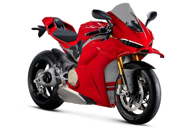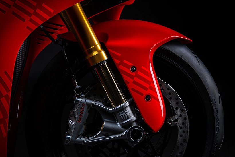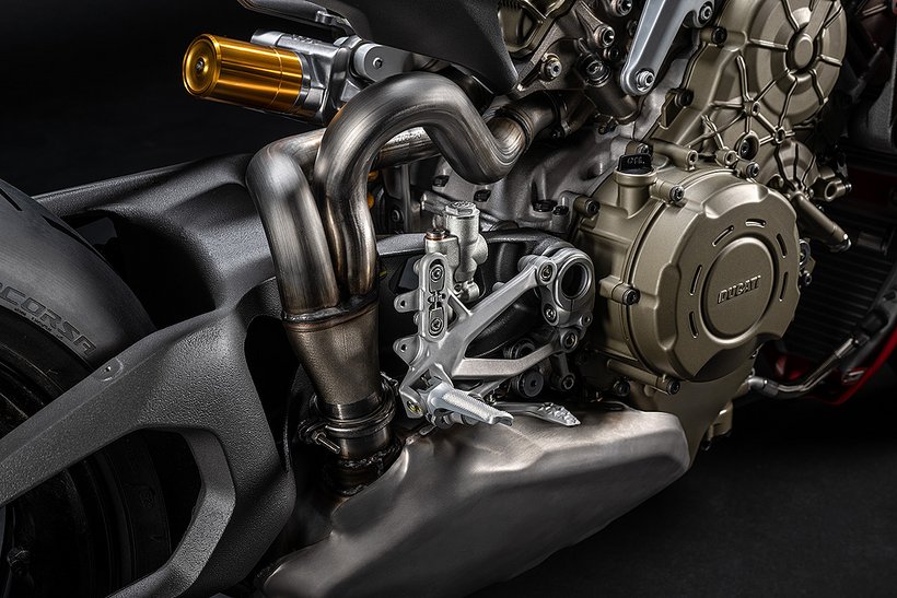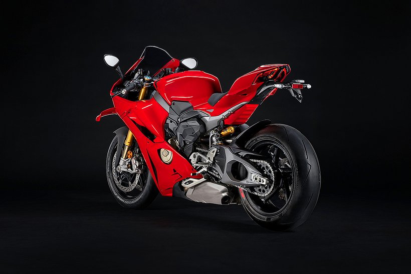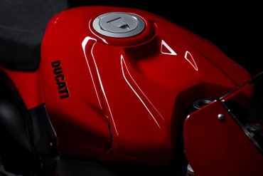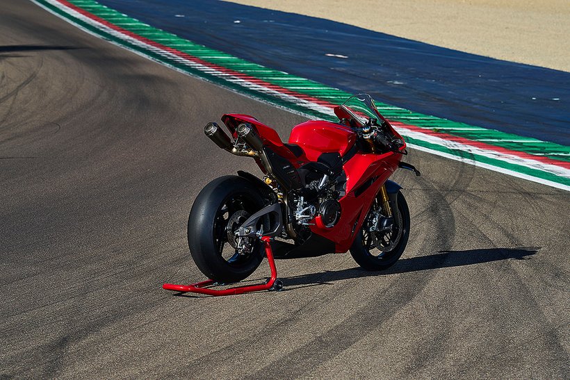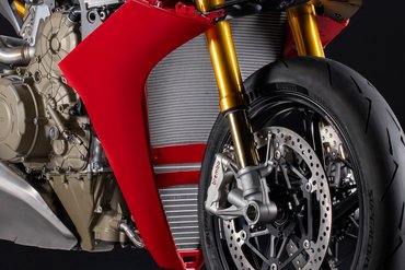 Die enge Zusammenarbeit mit Ducati Corse hat zu einem Motor geführt, der kompakt, leicht und zugleich äußerst leistungsstark ist. In der 90-Grad-V-Bauweise gleichen sich die Massenkräfte erster Ordnung konstruktionsbedingt aus, sodass auf eine Ausgleichswelle zur Reduzierung von Vibrationen verzichtet werden kann. Das spart nicht nur Gewicht, sondern verbessert auch die Drehfreudigkeit und Leistungsentfaltung des Motors. Im Vergleich zu einem klassischen Reihenvierzylinder ermöglicht die kompaktere Bauweise der V-Anordnung eine bessere Massenzentralisierung sowie eine geringere Stirnfläche, was die Aerodynamik verbessert. Zusätzlich reduziert die kürzere Kurbelwelle den gyroskopischen Effekt – ein klarer Vorteil für die Fahrdynamik, insbesondere bei schnellen Richtungswechseln. Das Desmosedici-Stradale-Triebwerk ist um 42 Grad nach hinten geneigt – wie bei den MotoGP-Motoren von Ducati. Diese Neigung verbessert die Gewichtsverteilung, schafft Platz für größere Kühler und erlaubt es, den Schwingendrehpunkt so weit wie möglich nach vorn zu verlagern.