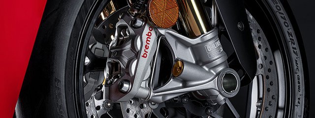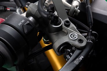 Brembo liefert die schwimmend gelagerten 330-mm-Bremsscheiben sowie die Monobloc-Bremszangen Brembo Hypure®. Diese aus einer Aluminium-Silizium-Legierung in einem Stück gefertigten Bremssättel mit vier 30-mm-Kolben sind pro Stück 60 g leichter als die Stylema-Bremszangen – ohne Abstriche bei der Steifigkeit. Sie leiten die beim Bremsen entstehende Wärme zudem um 4 % effektiver ab und bieten eine konstantere Bremsleistung, was dem Fahrer mehr Sicherheit gibt. Zusätzlich verfügen die Bremszangen über ein Pad-Rückhaltesystem, das den Widerstand beim Freilauf um 15 % reduziert. Die neuen Sättel werden über einen neu entwickelten radialen PR17/19-Hauptbremszylinder angesteuert. Dieser besitzt einen Kolbendurchmesser von 17 mm und einen Hebelweg von 19 mm (im Vergleich zum vorherigen PR16/21), was die Performance der Bremsbetätigung verbessert und den Fahrer bei der Suche nach seinen eigenen Grenzen unterstützt. Hinten kommt eine einzelne 245-mm-Scheibe zum Einsatz, die 0,5 mm dünner und somit 80 g leichter ist, kombiniert mit einem 2-Kolben-Bremssattel. Das gesamte Bremssystem wird durch das Race eCBS-System mit Cornering-Funktion unterstützt, das im Kapitel Elektronik näher beschrieben wird.