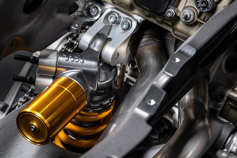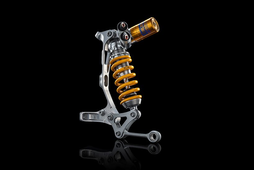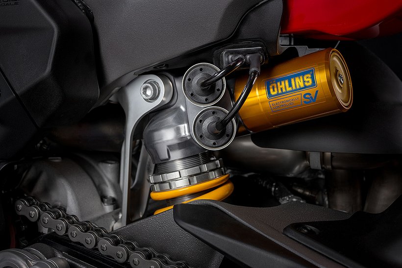Auch beim Federbein kommt die SV-Technologie zum Einsatz. Das verbaute Öhlins TTX36-SV Federbein kann in Zug- und Druckstufe elektronisch mittels Servomotoren angepasst werden, gesteuert vom neuen Öhlins Smart EC 3.0-System. Die Federvorspannung lässt sich manuell einstellen. Die TTX-Technologie bietet den Vorteil einer komplett getrennten Zug- und Druckstufendämpfung, wodurch das Risiko von Kavitation (Dampfblasenbildung) deutlich reduziert wird.