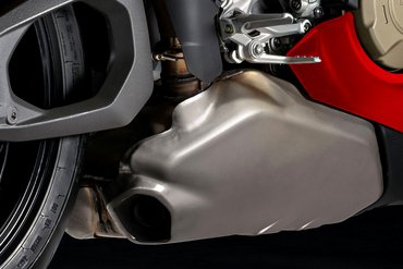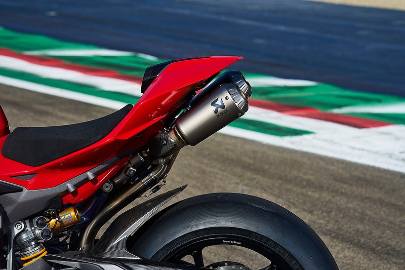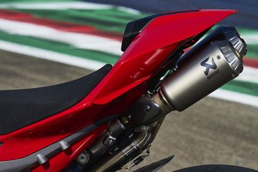 Die Racing-Auspuffanlage von Akrapovič aus reinem Titan, mit Schalldämpfern unter dem Heck, steigert die Leistung auf bis zu 228 PS bei 13.750 U/min und erreicht ein Drehmoment von 127,8 Nm bei 11.250 U/min. Gleichzeitig reduziert sich das Gewicht der Maschine um 6,6 kg. Der Geräuschpegel beträgt 105 dB, kann jedoch mit dem optionalen db-Killer auf 102 dB gesenkt werden. Alternativ bietet Akrapovič auch eine Under-Engine-Racing-Auspuffanlage an, die 224 PS liefert, das Gewicht um 6 kg senkt und einen Geräuschpegel von 109 dB aufweist, der auf 107 dB reduziert werden kann. Zudem ist ein ECE-zugelassener Schalldämpfer aus Titan mit Kohlefaser-Endkappen und Wabenraster-Abdeckungen erhältlich.