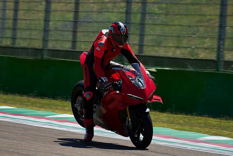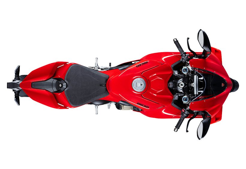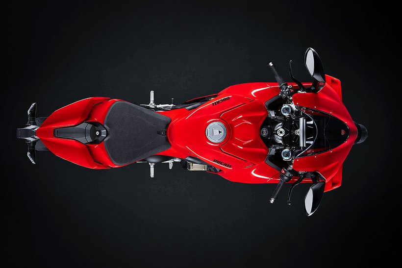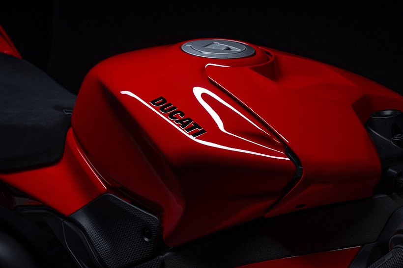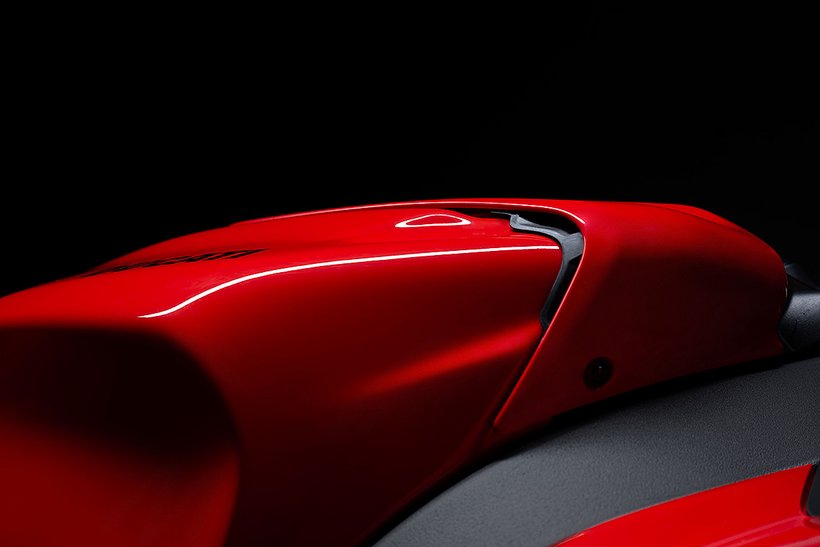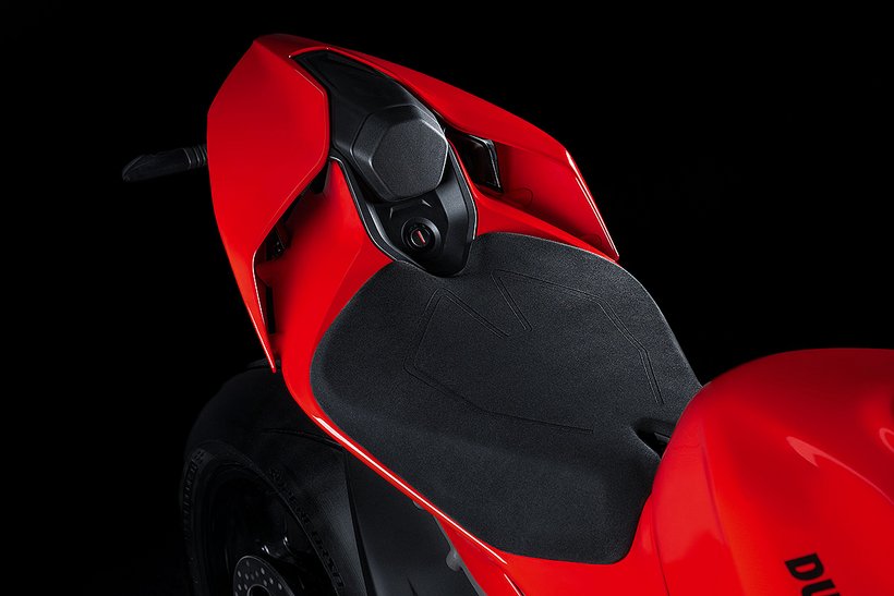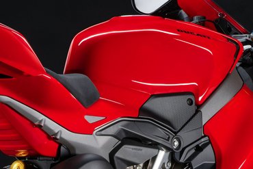 Die Sitzposition der neuen Panigale V4 wurde optimiert, um den Fahrer aerodynamisch besser im Motorrad zu integrieren und die Kontrolle auf der Rennstrecke zu verbessern. Die Sitzbank/Tank-Einheit ermöglicht mehr Bewegungsfreiheit in Längsrichtung und erleichtert die Positionierung durch eine spezielle Aussparung für den Kinnbereich des Helms. Der hintere Tankbereich und die seitlichen Pads unterstützen den Fahrer beim Bremsen, im Kurveneingang und in der Kurve. Gleichzeitig wird vermieden, dass die neue Form des Tanks in anderen Fahrphasen einschränkend wirkt. Dies erleichtert das Abstützen mit den Knien und verringert so auch die Armermüdung. Die Fußrasten wurden um 10 mm nach innen verlegt, was die Bodenfreiheit erhöht, die Aerodynamik verbessert, da der Fahrer seine Füße und Beine weiter innen positionieren kann. Auch die Kraftübertragung wird verbessert und der Fahrer kann mehr Druck auf die Fußrasten ausüben.