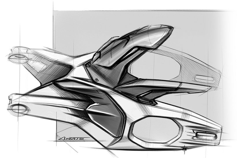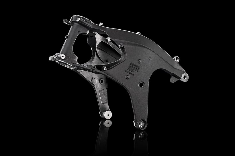 Die Hinterradaufhängung verwendet eine von der Desmosedici GP inspirierte Umlenkung, die über ein einteiliges, geschmiedetes Aluminium-Verbindungselement direkt am Desmosedici…