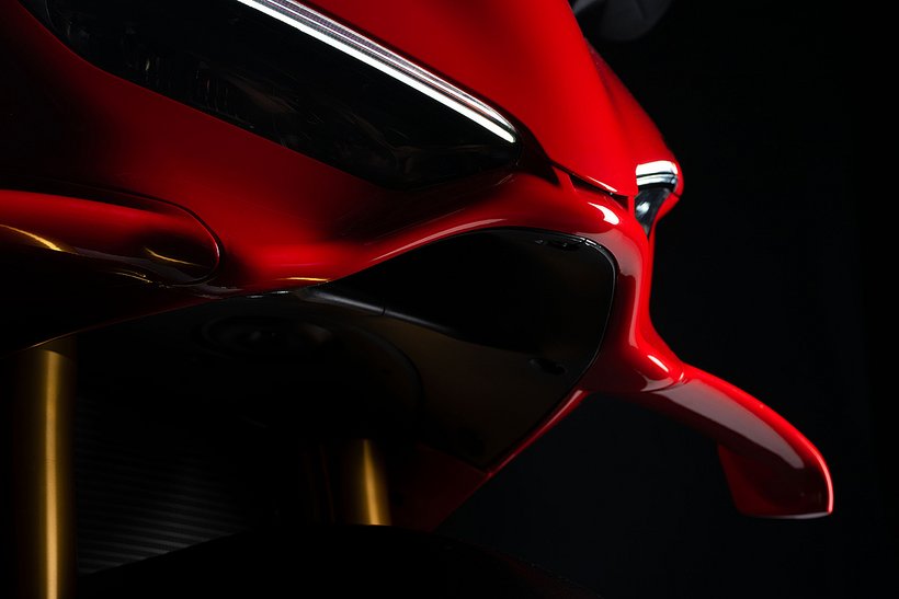 Der Full-LED-Scheinwerfer verfügt über ein extrem schlankes, V-förmiges Tagfahrlicht, das eine Hommage an die Ducati 916 darstellt, und der Scheinwerfer integriert auch die Blinker…