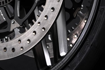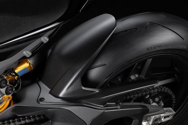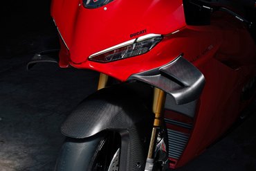 Die Panigale V4 Carbon ist mit Fünfspeichen-Felgen aus Carbon ausgestattet, die das Gewicht im Vergleich zu den geschmiedeten Felgen um 0,95 kg reduzieren und das Trägheitsmoment vorne um 12% und hinten um 19% senken. Dank dieser Felgen erhöht sich die Agilität des Motorrads bei Richtungswechseln. Zudem fällt es leichter, die Linie beim Beschleunigen in Schräglage eng zu halten. Ein weiteres Plus dieser neuen Felgen ist die Zulassung auch für den Soziusbetrieb in Verbindung mit dem als Zubehör erhältlichen Biposto Kit. Aber nicht nur die Felgen der Panigale V4 Carbon bestehen aus leichtem und hochfestem Carbon, sondern auch der vordere und hintere Kotflügel und die Winglets sind aus dem „schwarzen Gold“ gefertigt.