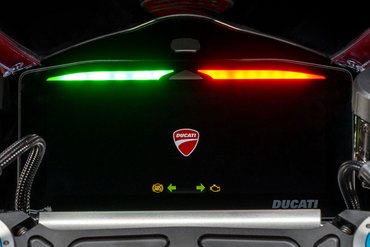 Ducati war 2012 der erste Hersteller, der mit der 1199 Panigale ein Full-TFT-Farbdisplay in ein Motorrad integrierte. Mit der Panigale V4 7G und Streetfighter V4 3G setzt Ducati erneut Maßstäbe: Das hochauflösende 6,9-Zoll-Full-TFT-Display im Seitenverhältnis 8:3 (1.280 x 480 Pixel) zeigt eine Vielzahl an Informationen mit optimaler visueller Klarheit an, ohne die Sicht des Fahrers in der aerodynamischen Fahrposition zu beeinträchtigen. Das Dashboard nutzt die Optical Bonding-Technologie, die auch bei Smartphones zum Einsatz kommt. Anstelle einer Kunststoffbeschichtung schützt eine verklebte Glasschicht den Bildschirm, die keinen direkten Kontakt zum Display hat. Dies gewährleistet eine hervorragende Lesbarkeit der Informationen, selbst bei Tageslicht. Der innere Bereich des Drehzahlmessers und die grüne LED am oberen Rand des Dashboards leuchten grün, wenn es Zeit zum Hochschalten ist, und wechseln auf Rot, wenn der Drehzahlbegrenzer erreicht wird. Die Navigation erfolgt über einen Schalter am linken Handgriff.