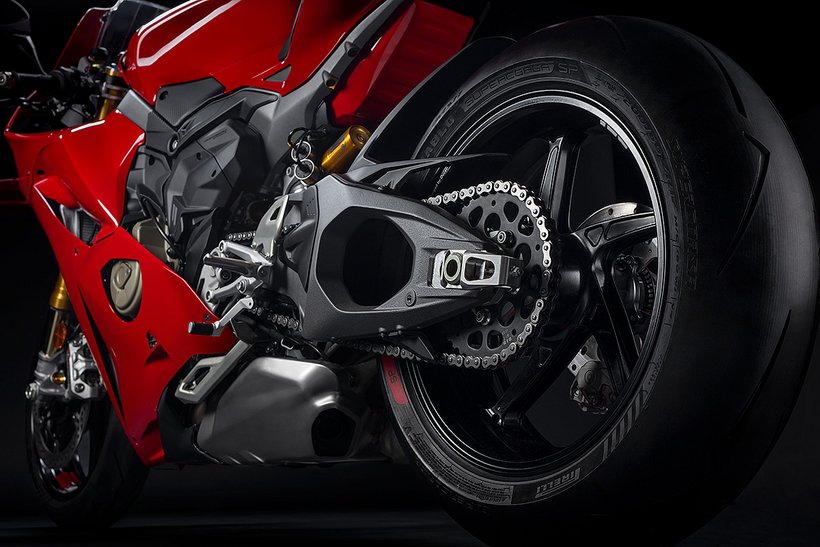 In den letzten Jahren ist das Niveau in der Superbike-Weltmeisterschaft dramatisch gestiegen – die Rundenzeiten nähern sich mittlerweile denen der MotoGP an. Hauptverantwortlich dafür ist die Weiterentwicklung der Reifen: Sie ermöglichen späteres Bremsen, größere Schräglagen und früheres Beschleunigen in Schräglage. Der Schlüssel zu schnelleren Rundenzeiten liegt also im späteren Verzögern und früheren Herausbeschleunigen. Um dieses Potenzial voll auszuschöpfen, forderte Ducati Corse – wie in der MotoGP – eine Zweiarmschwinge und ein komplett überarbeitetes Chassis. Der Abschied von der ikonischen Einarmschwinge war keine leichte Entscheidung, doch zahlreiche Back-to-Back-Tests zeigten signifikante Vorteile mit der neuen Lösung. Das bessere Feedback auf der Rennstrecke führte sowohl bei Profis als auch bei ambitionierten Amateuren zu deutlich schnelleren Rundenzeiten. Alle Testfahrer berichteten von höherer Stabilität beim Herausbeschleunigen mit weniger Unruhe im Fahrwerk, was zu mehr Vertrauen führt, einer natürlich wirkenden Tendenz, die Linie durch den Kurvenscheitel besser zu halten, sowie von überlegenem mechanischem Grip – selbst mit gebrauchten Reifen. Mehr Traktion, bessere Beschleunigung, mehr Sicherheit. Das Ergebnis dieser Entwicklung ist die neue „Hollow Symmetrical Swingarm“ – eine perfekte Kombination aus Funktionalität und Design. Die Schwinge wird im Aluminium-Druckgussverfahren hergestellt, wodurch die durchschnittliche Wandstärke – und damit das Gewicht – deutlich reduziert werden konnte. Auf Anweisung von Ducati Corse wurde die laterale Steifigkeit gezielt um 37 % reduziert, was sich gemeinsam mit der Senkung der ungefederten Massen positiv auf das Einlenkverhalten, das Feedback in Schräglage und die Traktion beim Beschleunigen auswirkt. Nachdem die technischen Herausforderungen gemeistert waren, widmeten sich die Designer der finalen Oberflächenbearbeitung, um der Schwinge nicht nur maximale Performance, sondern auch ein edles, hochwertiges Erscheinungsbild zu verleihen. So fügt sie sich nahtlos ins Gesamtbild der neuen Panigale V4 ein.