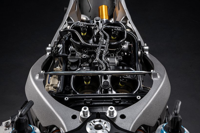 Der Desmosedici-Stradale-Motor nutzt vier ovale Drosselklappenkörper mit variablen Ansaugtrichtern, um die Gemischaufbereitung optimal zu steuern. Diese fortschrittliche…