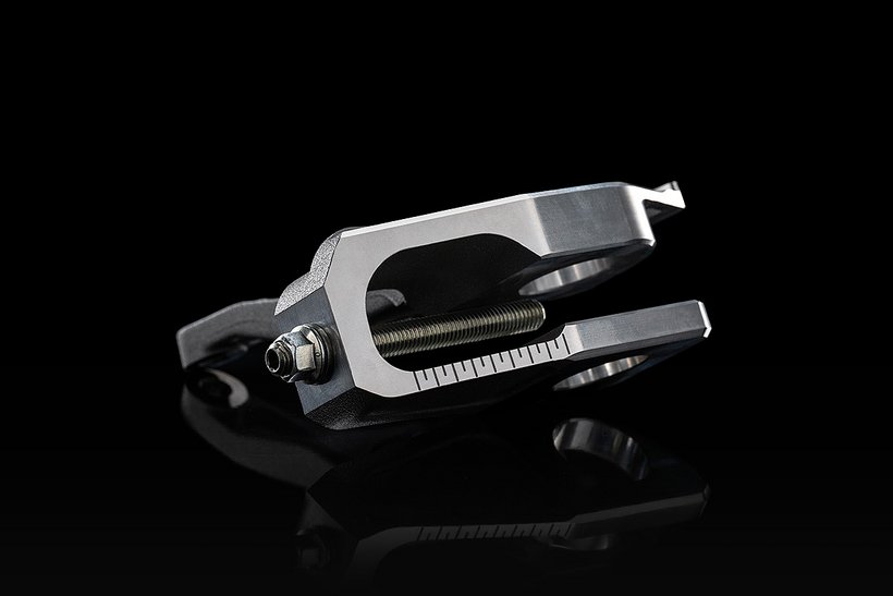 Die Schwinge der Panigale V4 7G ist mit monolithischen Kettenspannern ausgestattet – einer Technologie, die direkt aus der MotoGP stammt. Diese hochpräzisen Kettenspanner ermöglichen nicht nur eine schnelle und millimetergenaue Einstellung der Kettenspannung, sondern halten das Hinterrad auch beim Einbau exakt in Position. Das Rad selbst liegt dabei auf einer präzise gefrästen Führungsrille auf und bleibt auch ohne eingesetzte Achse an Ort und Stelle. Dadurch bleibt die Kettenspannung beim Reifenwechsel unverändert – ein Nachjustieren ist nicht erforderlich, da die Spanner automatisch wieder in die zuvor eingestellte Position zurückkehren. Der Radwechsel gestaltet sich dadurch genauso einfach und schnell wie bei einer Einarmschwinge – und lässt sich problemlos ohne fremde Hilfe durchführen. Der Kettenspanner auf der linken Seite besteht aus hochfestem, CNC-gefrästem Aluminium, um den Belastungen des Kettenzugs dauerhaft standzuhalten.