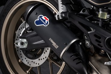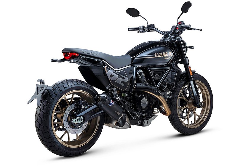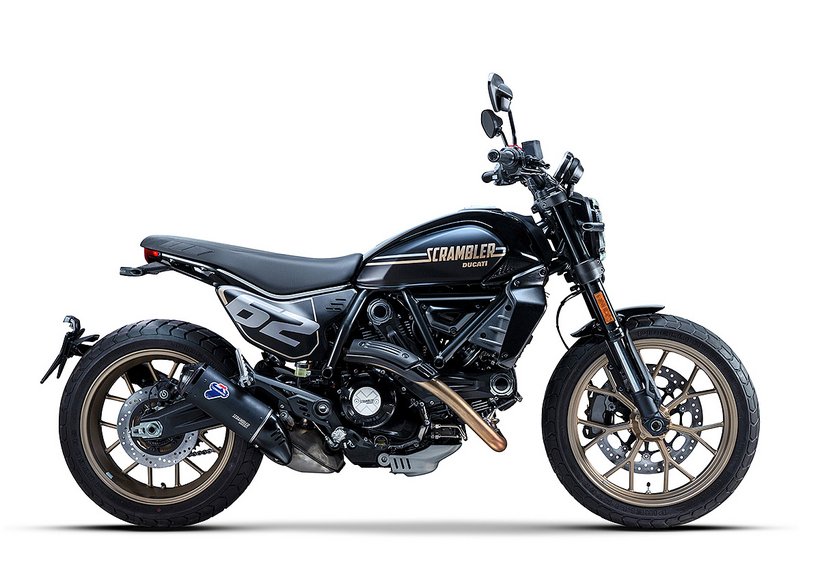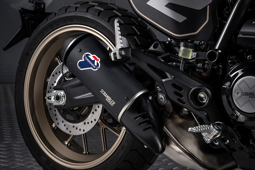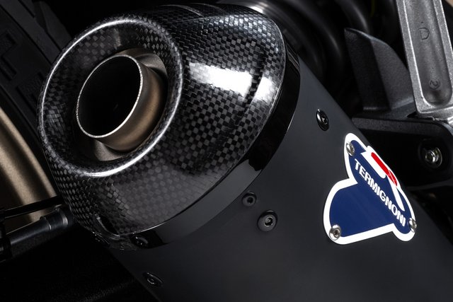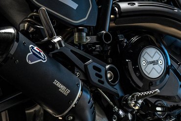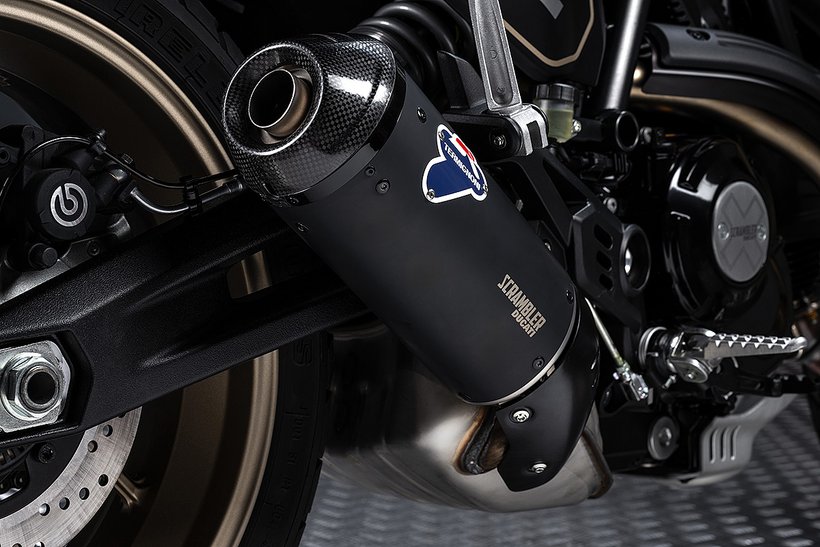 Die Scrambler Full Throttle ist mit einem straßenzugelassenen Termignoni Schalldämpfer ausgestattet. Die Dämpferhülle wie auch die Hitzeschutzabdeckungen sind in mattschwarz gehalten, die Endkappe ist in Carbon gefertigt.