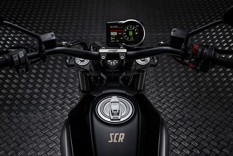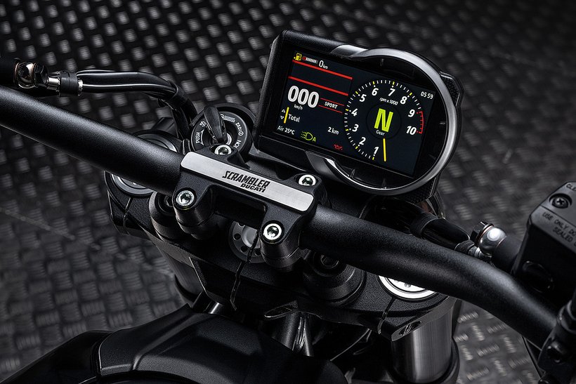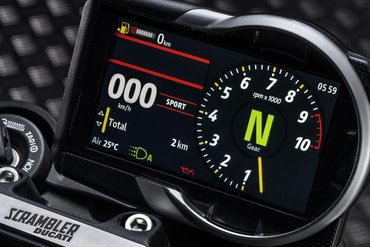 Das 4,3-Zoll-TFT-Farbdisplay ist modern und klassisch zugleich. Rechts werden der große Drehzahlmesser, der aktuell gewählte Gang und der aktivierte Riding Mode angezeigt. Links finden sich die Lufttemperatur, der Kraftstoffstand und die Informationen aus dem Ducati Multimedia System (DMS), welches es ermöglicht, das Smartphone über ein Bluetooth-Modul (als Zubehör erhältlich) mit dem Motorrad zu verbinden und bestimmte Funktionen über die am Lenker angebrachten Tasten zu steuern. In der DMS-Funktion werden die Bedienelemente des Musik-Players, der Verbindungsstatus des Headsets, eingehende Anrufe sowie Hinweis-Symbole für empfangene Nachrichten angezeigt.