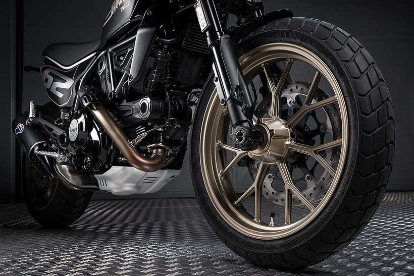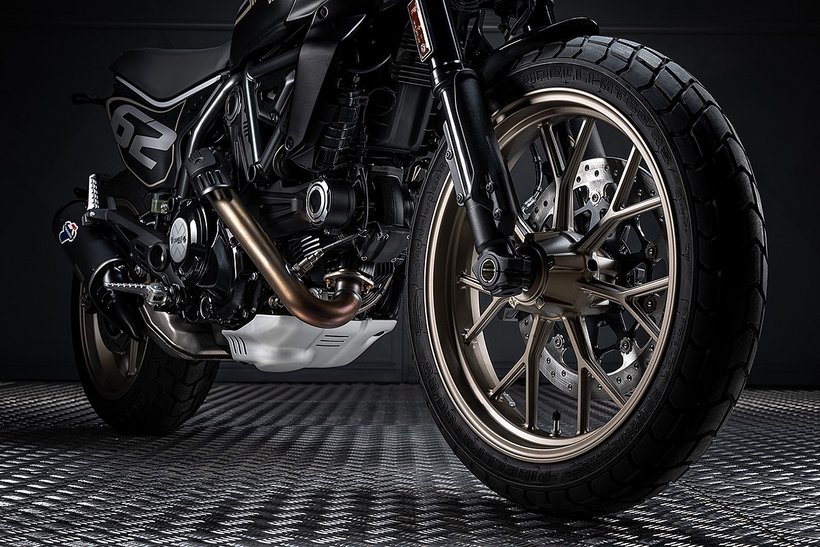 Ein kürzerer Kotflügel vorne, ein Heck das sogar ohne Kotflügel auskommt, bronzene Felgen und die aus dem ganzen Aluminiumblock gefrästen Ducati Performance LED-Blinker sind nur…
