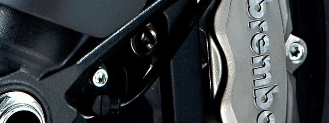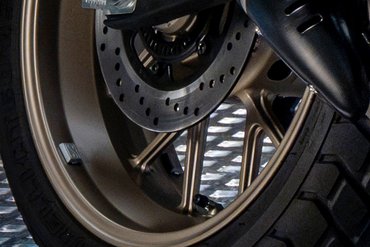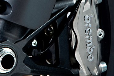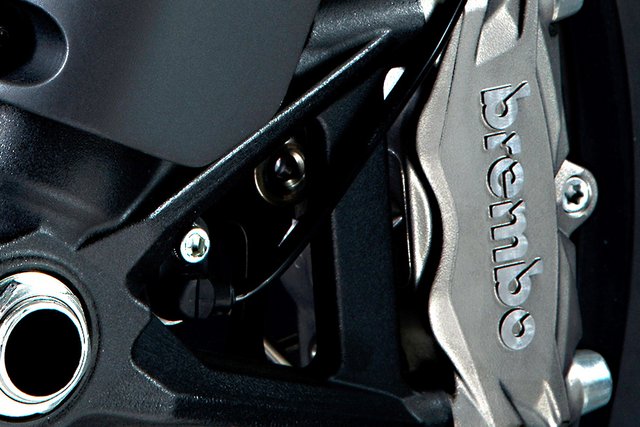 Die mächtige 330-mm-Bremsscheibe mit der 4-Kolben-Monobloc-Bremszange von Brembo sorgt für hervorragende Bremsleistung und exzellente Dosierbarkeit. Das serienmäßige Kurven-ABS, entwickelt in Zusammenarbeit mit Bosch, bietet maximale Sicherheit – selbst bei Regen und auf losem Untergrund.