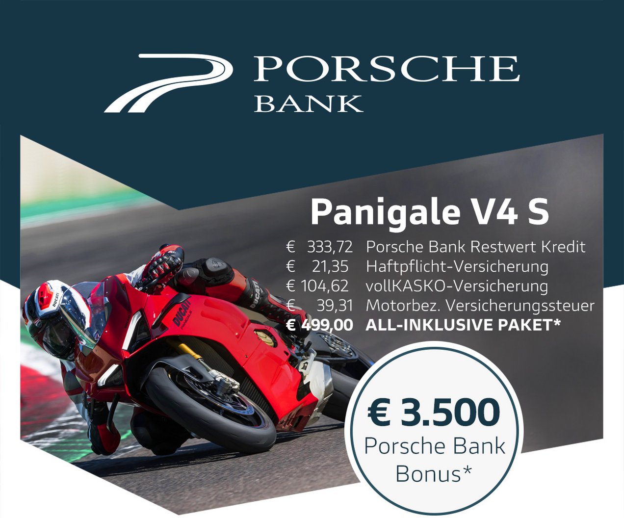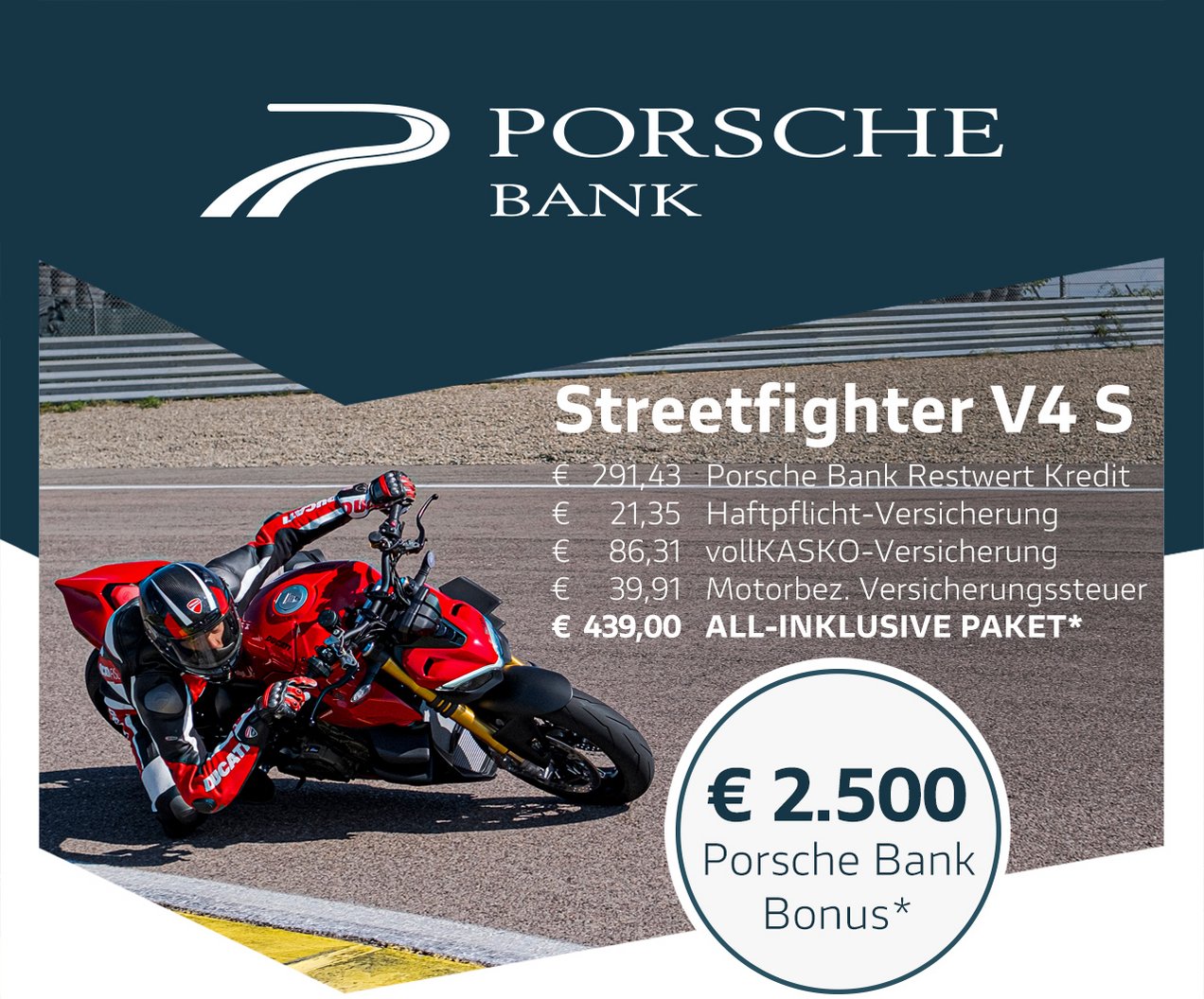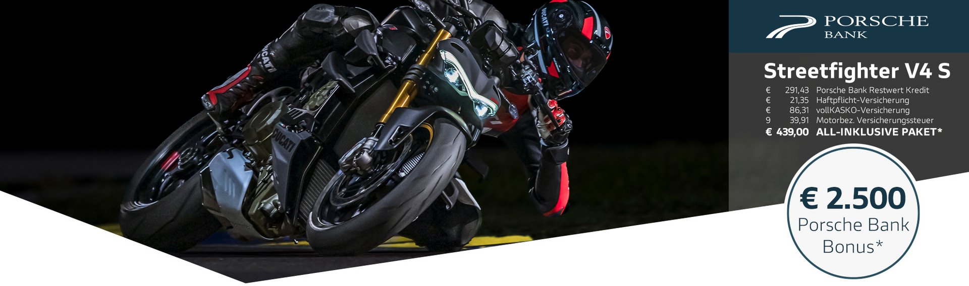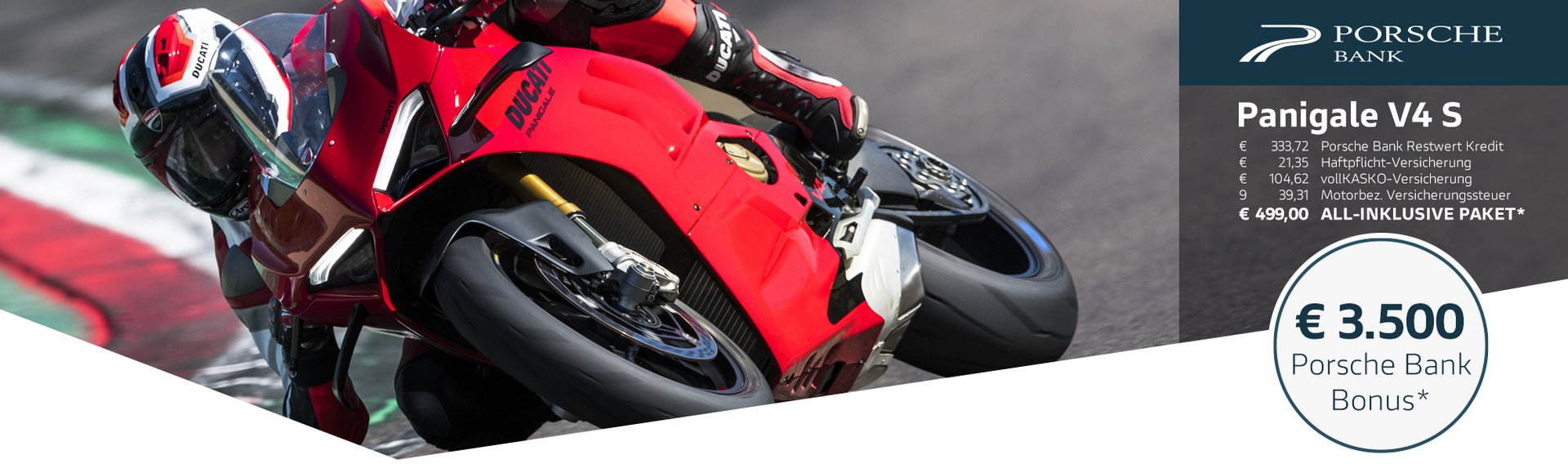 Gemeinsam mit der Porsche Bank, Marktführer in Österreich mit über 50 Jahren Erfahrung im Bereich Finanzierung und Versicherung, verfolgen wir ein klares Ziel: Dir das Motorradfahren so bequem, sicher und wirtschaftlich wie möglich zu machen. Kein anderer Hersteller bietet all diese Möglichkeiten und ein so hohes Maß an Flexibilität bei gleichzeitig besten Konditionen. Die Vorteile des Ducati-All-In Pakets sprechen für sich: