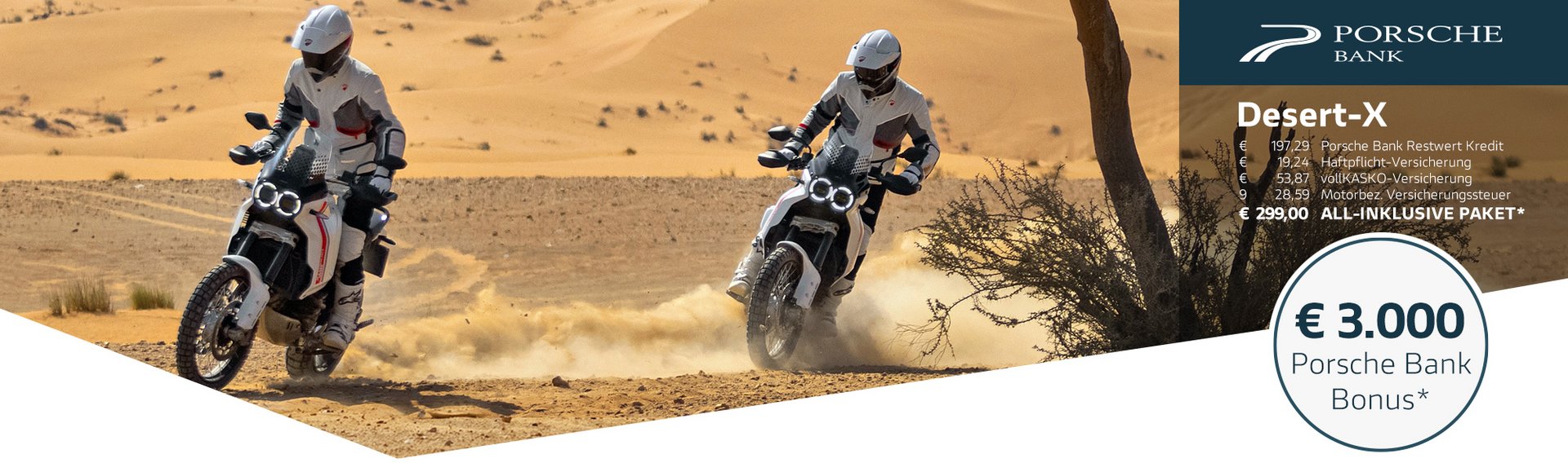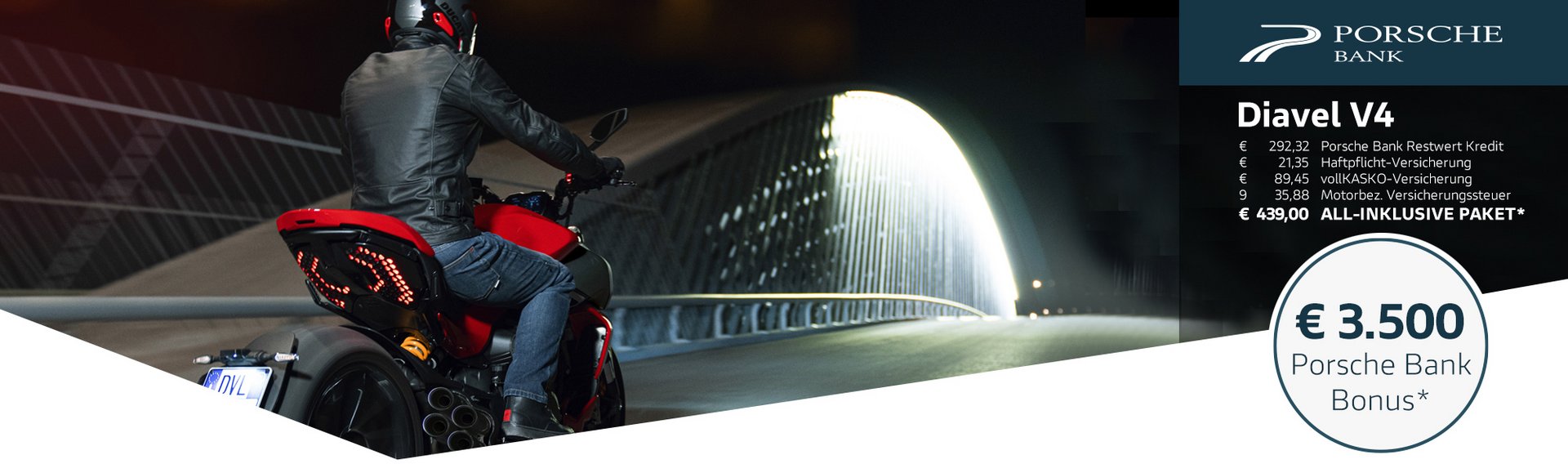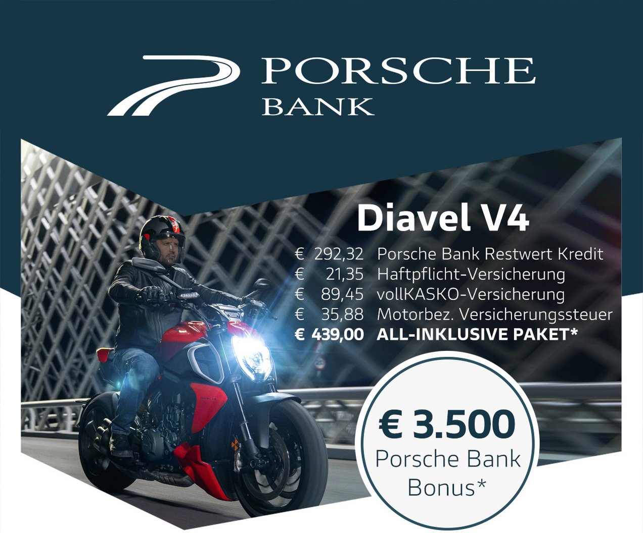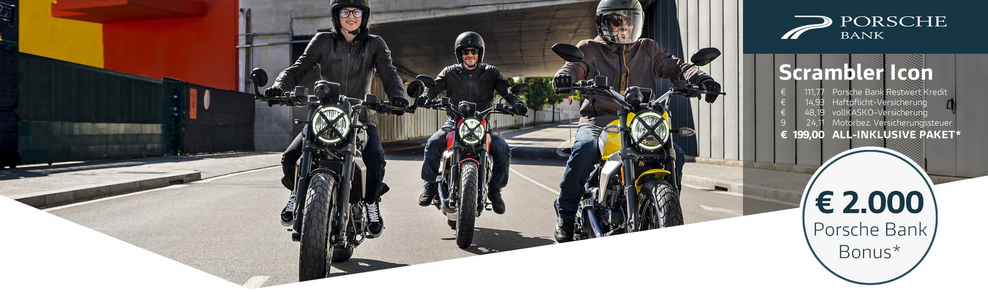 Gemeinsam mit der Porsche Bank, Marktführer in Österreich mit über 50 Jahren Erfahrung im Bereich Finanzierung und Versicherung, verfolgen wir ein klares Ziel: Dir das Motorradfahren so bequem, sicher und wirtschaftlich wie möglich zu machen. Kein anderer Hersteller bietet all diese Möglichkeiten und ein so hohes Maß an Flexibilität bei gleichzeitig besten Konditionen. Die Vorteile des Ducati-All-In Pakets sprechen für sich: