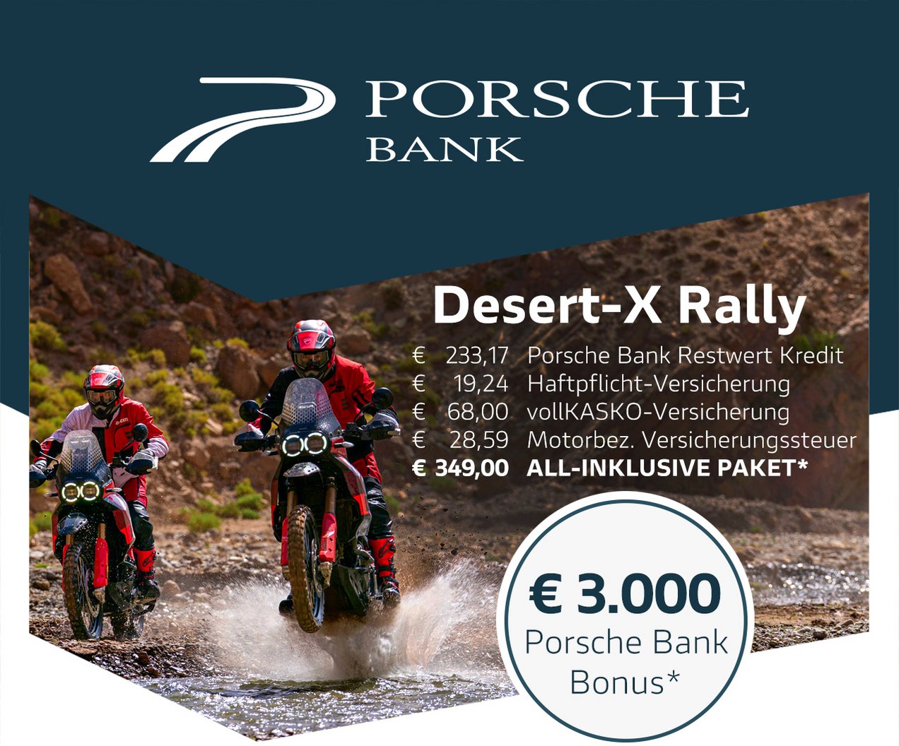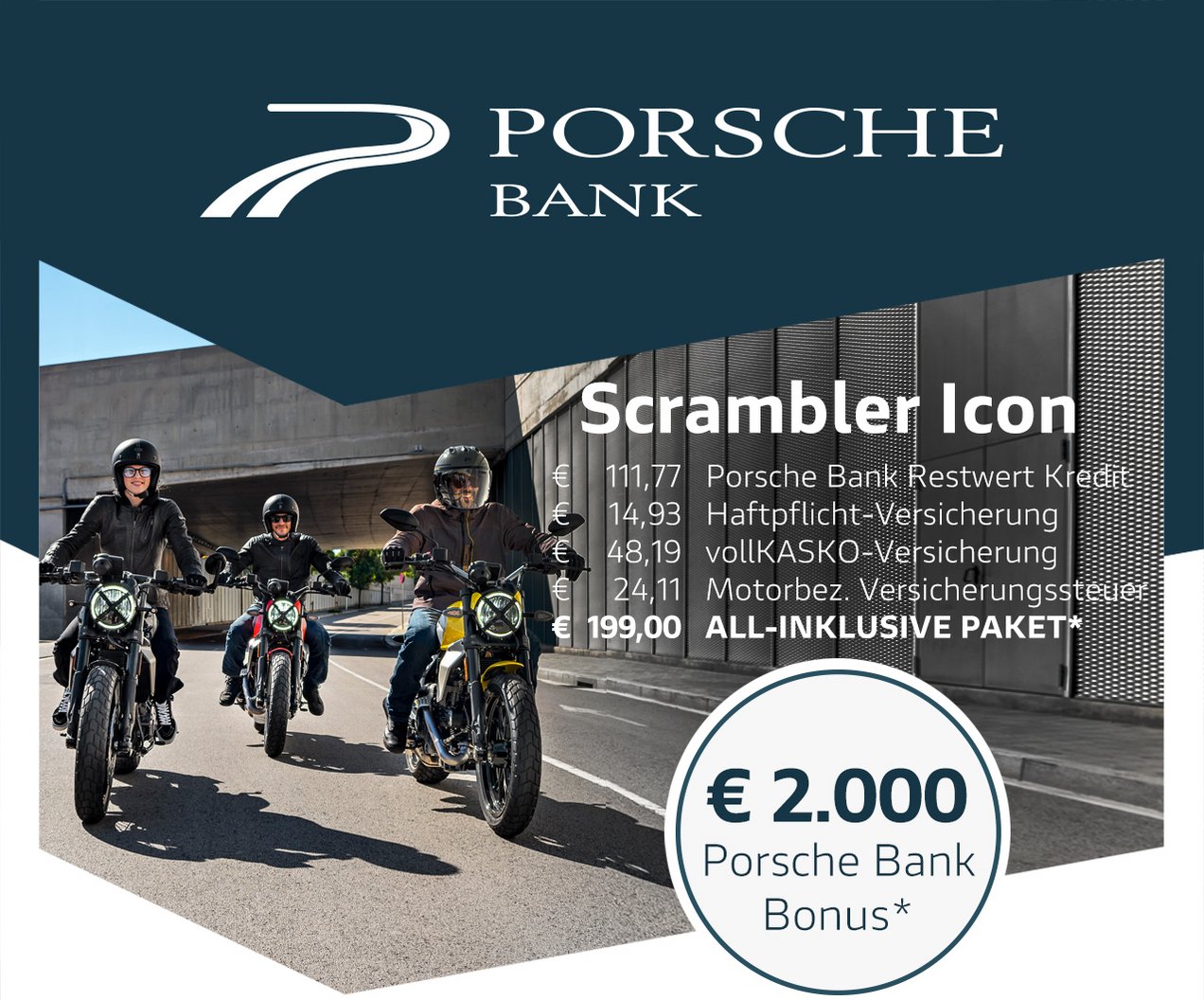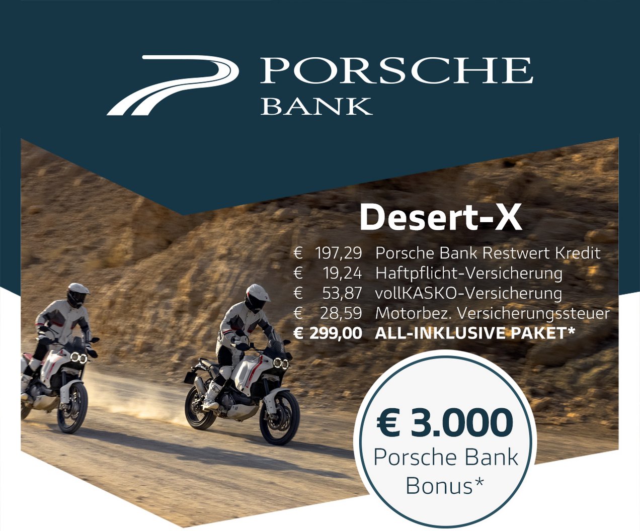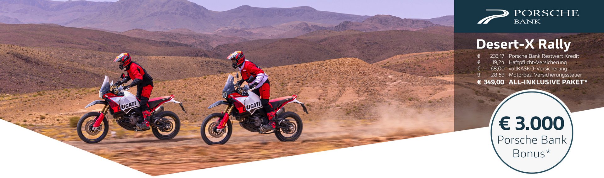 Gemeinsam mit der Porsche Bank, Marktführer in Österreich mit über 50 Jahren Erfahrung im Bereich Finanzierung und Versicherung, verfolgen wir ein klares Ziel: Dir das Motorradfahren so bequem, sicher und wirtschaftlich wie möglich zu machen. Kein anderer Hersteller bietet all diese Möglichkeiten und ein so hohes Maß an Flexibilität bei gleichzeitig besten Konditionen. Die Vorteile des Ducati-All-In Pakets sprechen für sich: