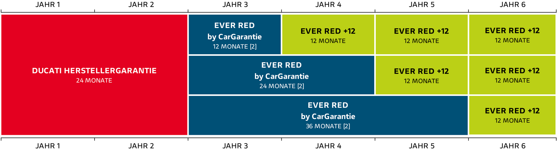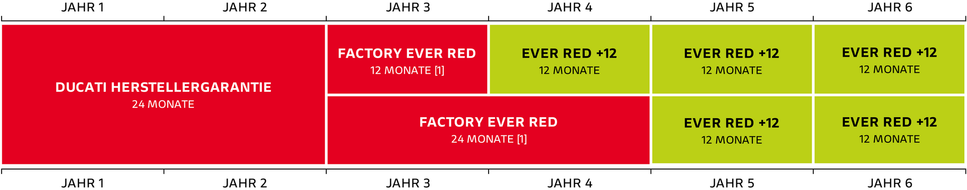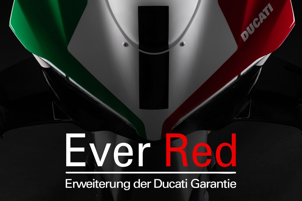 Ducati bietet auch die Möglichkeit die Herstellergarantie mit drei verschiedenen Produkten zu verlängern. Bei Wechsel des Eigentümers bleibt die Garantiedeckung bis zum Ablauf des gewählten Zeitraums bestehen. Aktiviere die Garantie noch heute und genieße den unbeschwerten Fahrgenuss mit Factory Factory Ever Red.