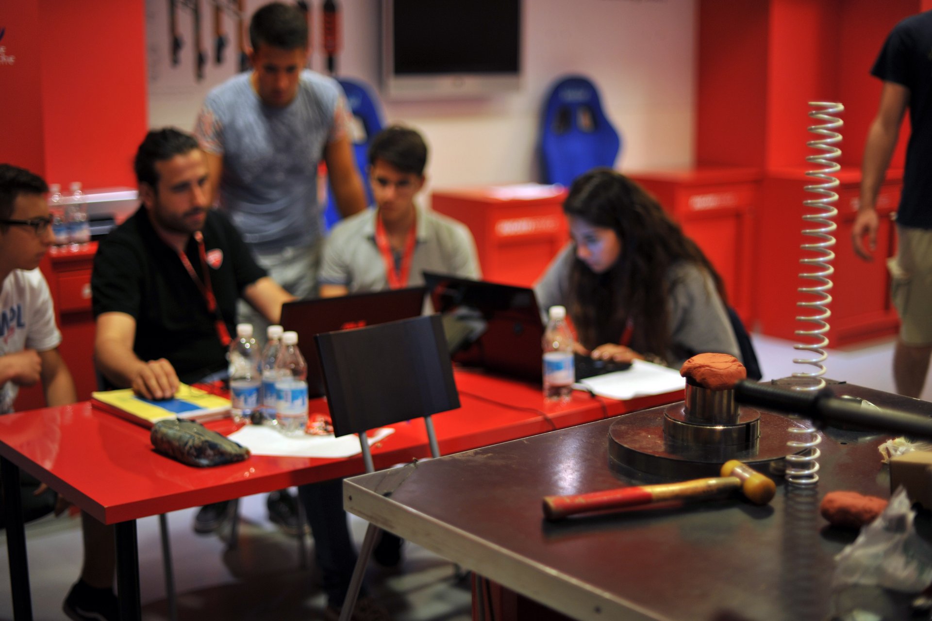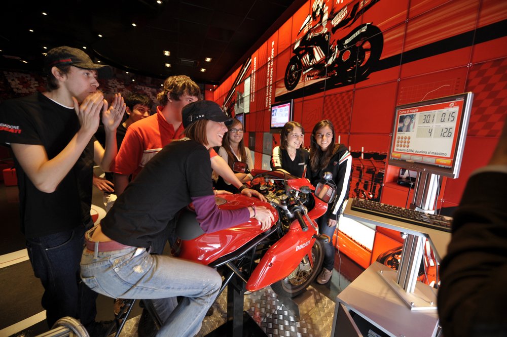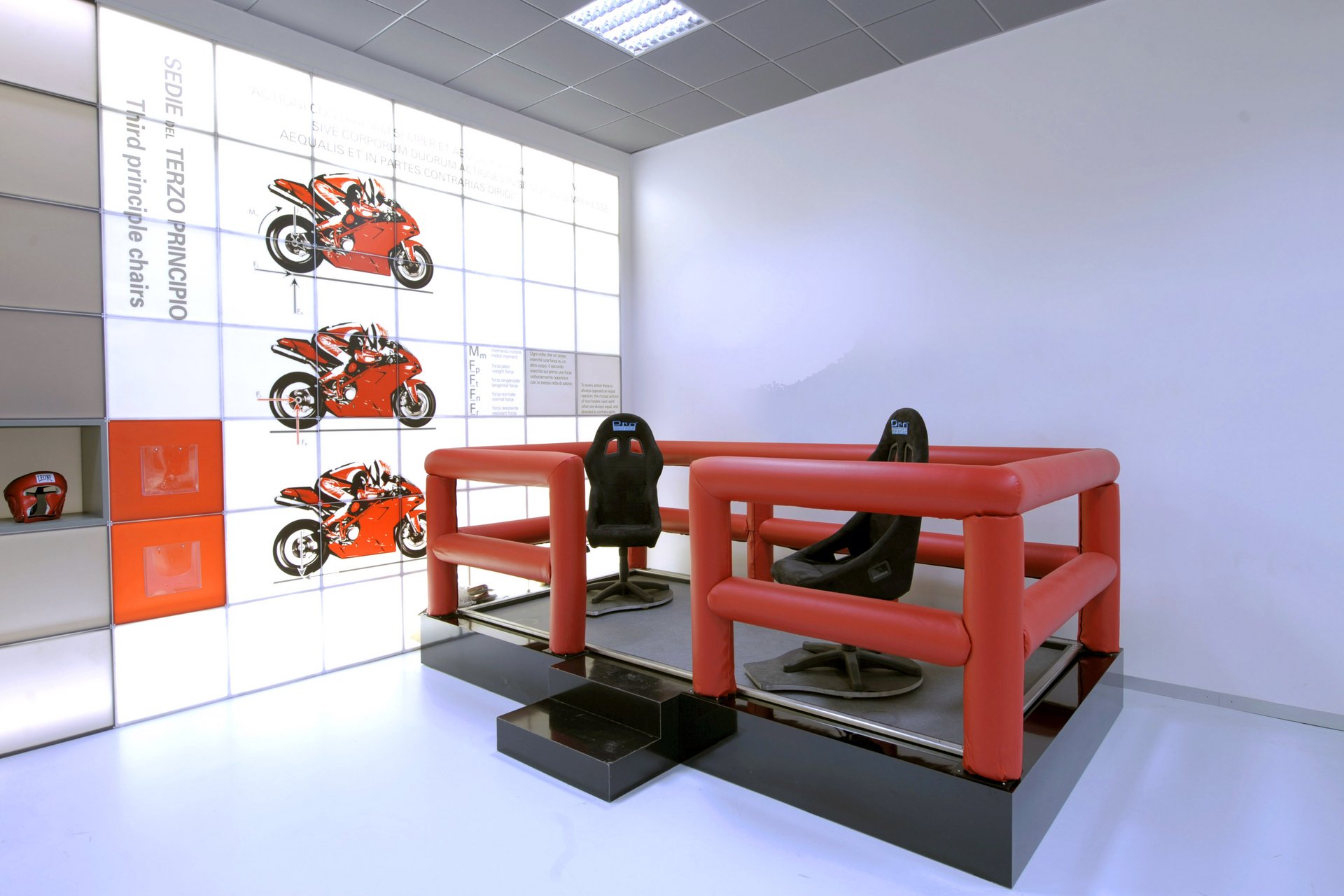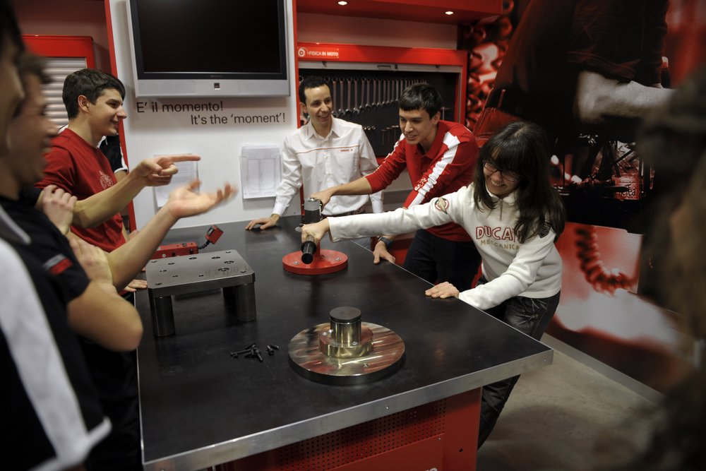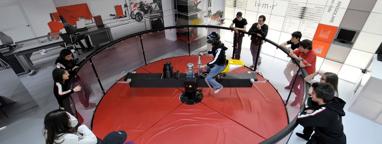 Der erste Raum entspricht einer Ducati Werkstätte mit vier interaktiven Stationen, die es ermöglichen, Schritt für Schritt in einfacher und intuitiver Weise Grundlagen der Physik zu erkunden: Kraft, Drehmoment, Reibung, Impuls und Winkelimpuls...